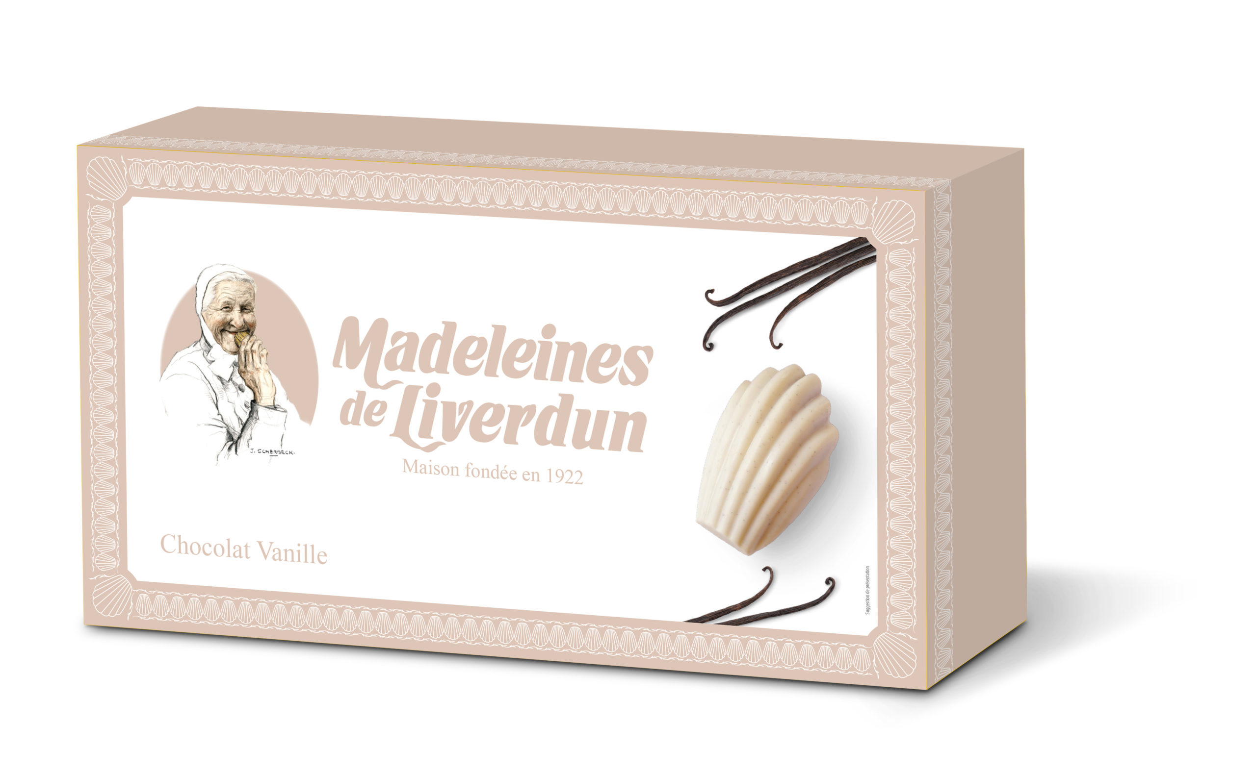 Chocolat blanc coloré aromatisé vanille (33%) (sucre, beurre de cacao, lait entier en poudre, lait écrémé en poudre, émulsifiant : lécithine de soja, poudre de vanille épuisée, arôme naturel de vanille), sucre, farine de blé, œufs frais (16%), beurre (10%), lait entier, sirop de glucose, poudres à lever : tartrate de potassium et carbonates de sodium (blé), arôme naturel de vanille (0,5%), sirop de sucre inverti, sel.